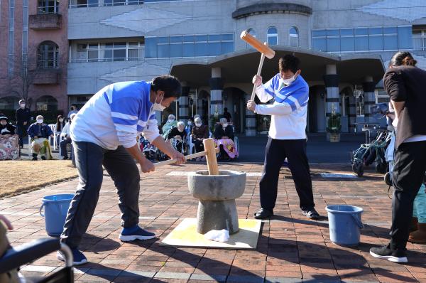 餅つき初心者の職員には「よいしょ~、よいしょ~!」のかけ声で利用者さんが盛り上げてくださいました。