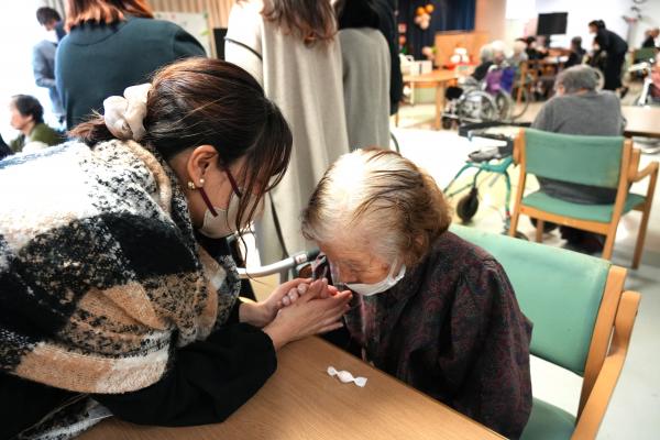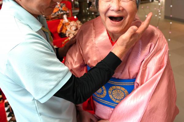 今年は着物で参加された利用者さんもいらっしゃいました。口紅もつけてもらって、とても嬉しそう。
