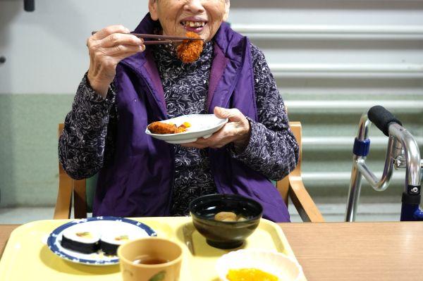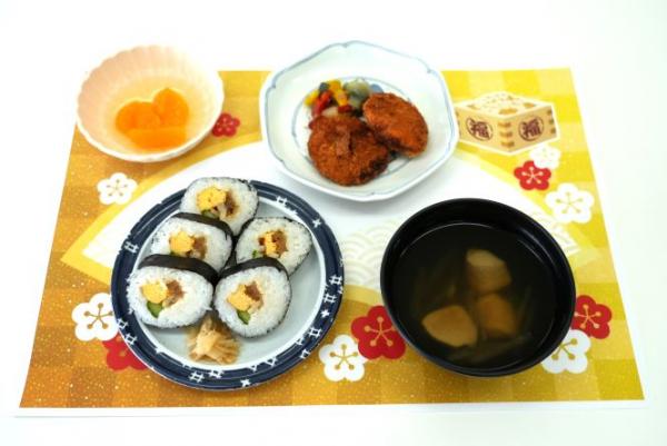 お昼ご飯は「恵方巻(は危ないので、巻き寿司)」「いわしのタタキフライ」「いわしのつみれ汁」等、節分らしいメニューでした。